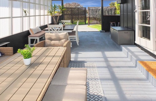 The quintessential coastal Kiwi Bach with a modern Hampton twist, at fabulous Foxton Beach.
