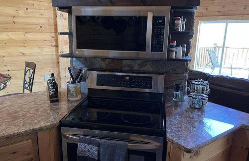 The cabin has a very expansive great room, featuring an eighteen-foot cathedral ceiling and a gas fireplace. The kitchen is designed to appear as an outdoor cooking area, with granite countertops and accent lighting. A dining area features a one-of-a-kind dining table made by craftsmen who bring out the beauty in the wood. Our cabin is now equipped with up to 300Mbps fiber internet.