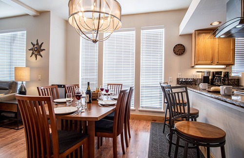 This spacious 1,756-square-foot condo enjoys a spectacular top-floor, corner position, offering an abundance of natural light and 270-degree views that reach Baldy, Frenchman's Gulch, and Griffin Butte. The open-concept living area sets the tone for a relaxing escape with a warm fireplace and flat-screen TV for downtime, a dining area for meals and board games, and a modern kitchen fully equipped for your stay.
