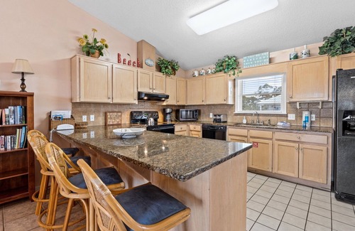 The queen master bedroom has an ensuite bathroom with a separate tub and shower. Just across the living room are two queen bedrooms with a shared bathroom. Down the hall from the kitchen is a twin-over-twin bunk bed room. There is a laundry room and a half bathroom along this hallway.