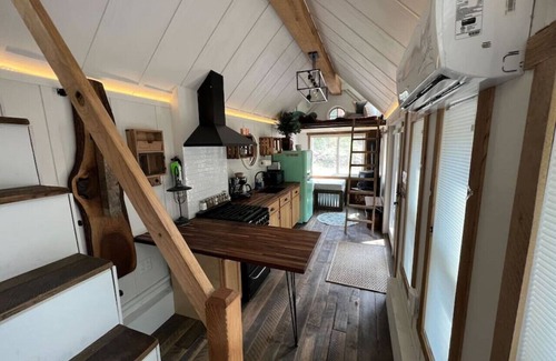 Snowshoe Hare is a cozy tiny home with a lofted king bed, full kitchen (with a compact, bar-style dining area), couch nook, and a full bath with a combination shower-tub. It includes an outdoor deck space with a propane fire pit, gas grill, and seating. Please note that the lofted sleeping quarters are accessed by a staircase and require some nimble maneuvering to get into bed—we think it’s super cozy, but please only book if you're on board with some ducking (see photos)!