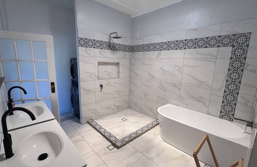 Unwind in the large bathroom with a soaking tub after a day of city exploration. The living area provides a relaxing space and a tranquil night's rest.