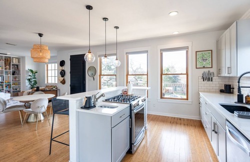 Your friends or family will be close to everything when you stay at this centrally-located home with a pool in Travis Heights, a walk to Austin's buzzing South Congress Avenue for access to shopping and restaurants. You may not want to leave the pool in the backyard, but the house sits adjacent to Little and Big Stacy Park. Or, hit the boardwalk along Lady Bird Lake, a 1-mile walk from the house.