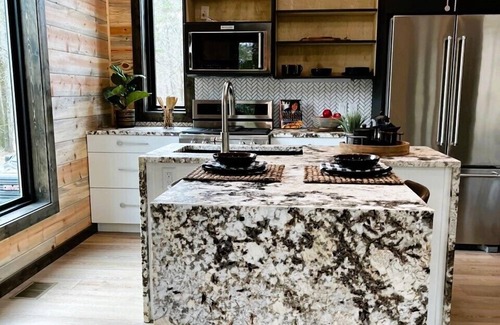 From the stainless-steel fixtures, high-end Kitchen Aid appliances, Sputnik lighting, custom open cabinets,and waterfall edge countertops made from leathered granite, the designer kitchen is also indicative of one found in a New York apartment, efficient and stylish. Within the well-appointed kitchen, you will find all the small appliances, utensils, and serving dishes needed to prepare a gourmet meal or a simple late-night snack. Sit at the kitchen table and enjoy your morning coffee while your loving chef makes you a delicious breakfast (or vice versa).