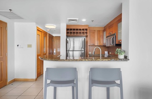 The kitchen at the studio is fully equipped for an extended stay and is ideal for those who like to socialize while preparing meals, as it is adjacent to the living room. The kitchen has granite countertops, a bar counter with 2 stools, a full-size fridge, a microwave, a stovetop, and a dishwasher.