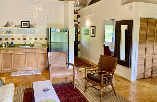 Two covered porches offer seating areas to enjoy the cooling tropical breezes and lush mountain views. Inside, you'll enjoy the comfortable, airy space with lots of fun, artistic touches, a fully equipped modern kitchen, full bathroom with large walk in shower, bedroom with queen-size bed and four pillows, living area with full-size futon, and a separate dining area.