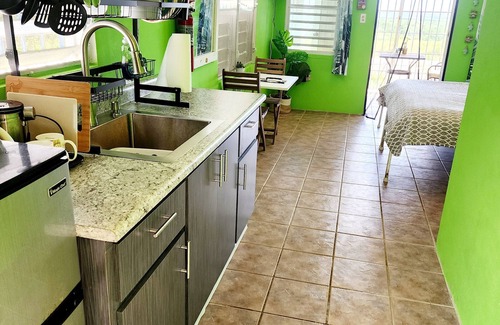 SoliMar Verde Studio offers king bed, galley kitchen, private entrance, private bathroom, shared balcony overlooking the Caribbean Sea, WiFi, satellite TV, beach towels, beach chairs & cooler.