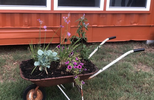 Everything becomes a piece of conversation. Whether it is the converted 53’ Conex box “tiny home” itself (there’s nothing tiny about it!), the high-end amenities, the top deck, the whimsical wildflower backyard, the copper decorated kitchen with full-size appliances, dinnerware, pot and pans, ethanol-burning fireplace, spa-like rain shower, Japanese soaker tub, or the one-of-a-kind view.