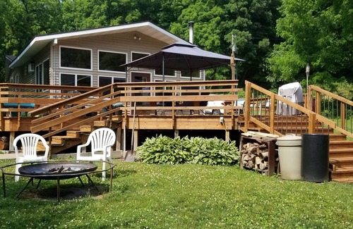This is a beautiful two bedroom 1044 sq. foot cabin that sleeps six in the woods of Wisconsin. The cabin features a large living room with a wood stove, fully equipped kitchen, a large bathroom with double wash basins. A washer and dryer are available. One bedroom has a queen size bed and bunk beds. One bedroom has a queen size bed. . Outside there is a huge deck, 624 square feet, with a gas grill and a Blackstone griddle. A large fire pit and chairs are right blow the deck.. New siding and windows were completed in 2016. If peace and solitude are what you are seeking this is absolutely the place. The cabin is a great place to escape, to relax and watch all of wonderful wildlife like deer, ducks, eagles and turkeys. If you enjoy stargazing, this is the place to be as the cabin is located in the Driftless Region, a prime place for dark skies, away from "light pollution".