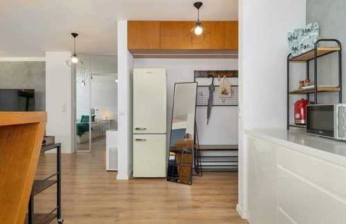 Extremely stylish, air-conditioned apartment of 68.5 m² is designed for 3 people. It consists of a spacious living room with kitchenette, separate bedroom and bathroom with shower and toilet. The interior is functionally designed and aesthetically finished, meeting all the needs of guests. The geometric pattern on the wall in the living room, referring to Mondrian's paintings, gives the apartment an unusual character. The living room, equipped with a comfortable sofa and a flat-screen Tv, and the bedroom with a double bed, provide a perfect place for rest and relaxation. In addition, the apartment comes with a balcony with garden furniture, where you can enjoy a cup of morning coffee in peace. The apartment has access to high-speed free Wifi Internet and provides a place to work remotely or study - in the bedroom you will find a desk with a chair. A wide range of amenities and comprehensive furnishing of the apartment with necessary kitchen and bathroom accessories and equipment guarantees a comfortable stay. To facilitate the start of each stay, a complimentary set of toiletries (soap, shampoo and shower gel), towels and linens are provided.