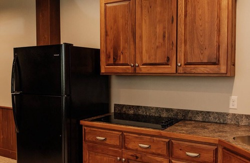 Nestle in for a cozy getaway in this suite that gives tribute to our melodic friends. Adorned with spectacular woodworking and highlighted with beautiful pictures of a variety of birds, this spacious one-bedroom suite features a full kitchen, living room with a stone fireplace, TV, sectional sofa, and a full bathroom with a walk-in tiled shower and two-person Jacuzzi. This suite comes with a cement patio under an awning, perfect for sitting outside and listening the birds singing. This suite is an ADA compliant suite.