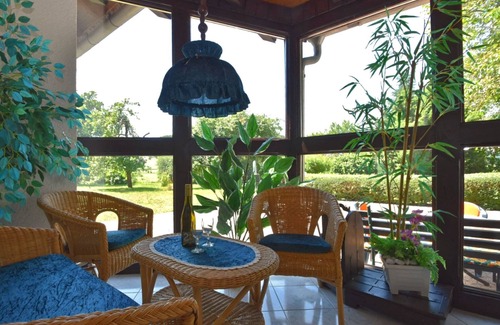 conservatory, washing machine(paid), heating(central, oil), terrace(private, 20 m2), garden(private, fenced, 700 m2), garden furniture, BBQ(charcoal), 2x parking, pond, play equipment, slide, fitness equipment, bicycles available(paid), ironing board, iron, insect screens, Sunscreen, Swing set