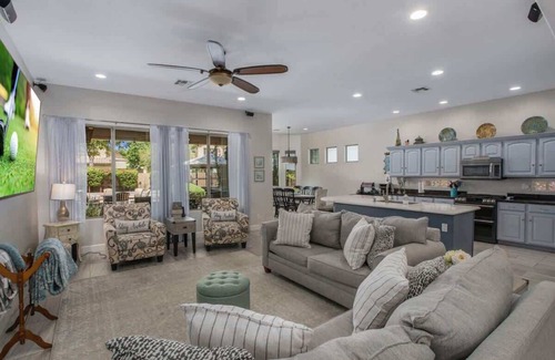 The home is located in South Chandler, near the desirable Ocotillo area. The home is in a gated community, with a park and playground. It is close to walking trails, multiple golf courses, and several entertainment opportunities. This home includes plenty of outdoor seating areas, fire pit, heated hot tub, propane BBQ grill. Inside offers a fully stocked kitchen with GE Cafe appliances, all the pantry necessities to truly make the most out of your stay, and an office space.