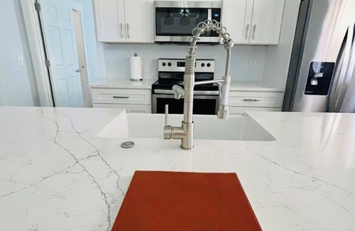 - Fully Equipped Kitchen: Enjoy a well-stocked kitchen with a farmhouse porcelain sink, quartz countertops, and modern stainless steel appliances, including a dishwasher, refrigerator, and microwave.