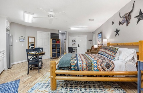 Located on a 13-acre estate in a quiet neighborhood, this cozy southern studio has a rustic feel and is decorated to give visitors a warm Texas howdy. The owners family live on the property, but the studio is separate from the house and is quiet. You are welcome to borrow some tennis rackets or pickle ball paddles and play on the lighted court. There is a separate driveway and covered parking for 1 car.