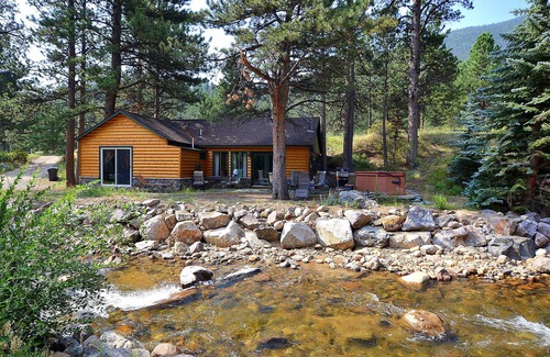 Our 'JVRSpa River Cabin' is on 450' of the beautiful Fall River. Riverfront Hot Tub, Mountain Views, Fish in the River, Lounge on Patio, Steam Shower, Wildlife - Moose, Elk, Fox, Coyote, Wild Turkeys, Bears & Big Horn Sheep have been seen at our home. 2 miles to Rocky Mountain National Park & downtown Estes. Bike path into Rocky Mountain National Park just across the road.