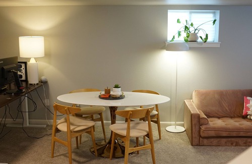 Welcome to the private modern basement guest suite of our new home in Everett. A spacious living room with big-screen TV, a bedroom with a high quality queen-sized mattress, ergonimic office chair and standing desk, a bathroom with a shower and his-and-hers sinks. Everett downtown and restaurants are within walking distance; Funko is a short walk. This unit does not have a kitchen but many restaurants and grocery stores are steps away. Plenty of free street parking.