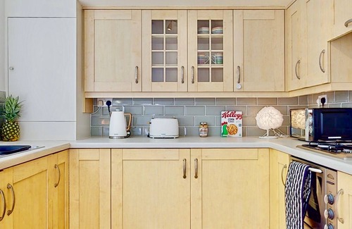 The kitchen has huge windows that overlook the private communal gardens with beautiful view of rhododendrons and flowers to enjoy while you cook! Oh and it’s also fully equipped with new appliances and kitchenware (2023), there is an electric hob, oven, microwave, fridge / freezer, , and toaster. Plus everything from pots pans, pizza cutters mixing bowls and all you need to cook in your home.
