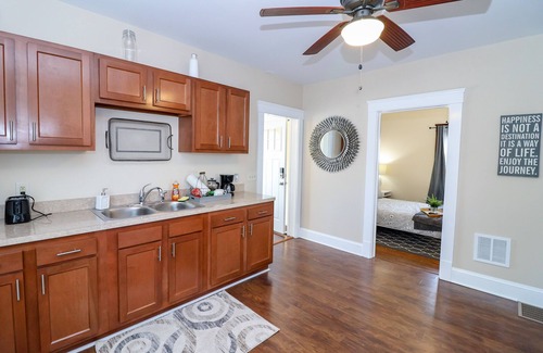 The standout feature is the enormous second bedroom, which spans the entire third floor, providing a quiet and private space to unwind or work remotely. Both bedrooms are comfortably furnished with quality linens and thoughtful touches. The kitchen includes all the essentials you need for a long-term stay, while free street parking and easy access to major highways make commuting effortless.