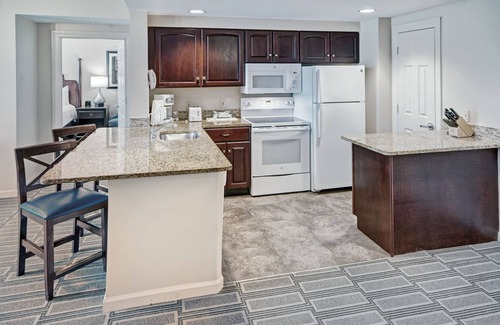 This spacious two bedroom condo is 1,155 square feet. The suite provides luxurious amenities, aside from the two private bedrooms, one with a king bed and the other with two double beds. The separate living area includes a queen sleeper sofa, full kitchen, and a dining area. The kitchen adds affordability and convenience, allowing for delicious meals to be made from the comfort of the suite. The maximum occupancy of this room is six guests.