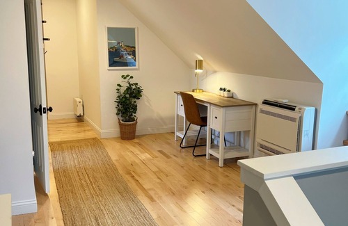 Built in 1875, the space features a separate first floor entrance followed by a living room, full kitchen, breakfast nook, dining area, and petite patio on the second floor. The third floor brings a quirky layout with an open office area, a small reading space and the two bedrooms (one king, one queen). The king bedroom includes an additional open door office for added workspace.