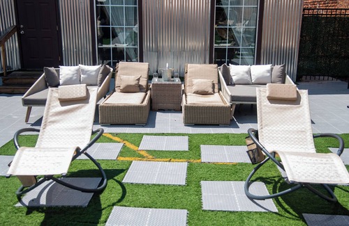 Third Floor Rooftop: Expansive open-air space with lounge seating, gazebos, and 2 smart TVs with streaming access