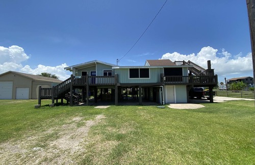 Welcome to the Sea Glass Hideaway! This uniquely designed and spacious beach home sits on two bayside lots and is just a short golf cart ride (about 300 yards) to the beach. This home is great for entertaining with an awesome space underneath the home with an outdoor bar area, a couples swing, a hammock, and a game closet. There are also multiple decks. One in the front, a 2nd story deck with access from the back yard & Master Suite, and a 3rd story sun deck with great views! There are also 2 indoor living areas and a large outdoor covered cooking area equipped with a smoker and a picnic table! The Sea Glass Hideaway offers an RV Hook-up with a 30 Amp connection and a City Septic Hook-up! There is also parking galore, so bring all your toys! There is a covered carport, a lane for an RV, and two lanes for a Truck/Boat Combo and/or a Truck & Trailer combo! We are 3 miles from Delino's Bolivar Yacht Basin which is a Public Boat Ramp & Bait Camp that has direct access to the Intracoastal Canal and Galveston Bays.