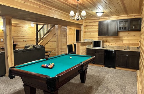 -- Game room with wet bar, Foosball, Pool table, NBA Jam 4-player Arcade, Large Flat screen TV with satellite TV, Blu-Ray player and movies
