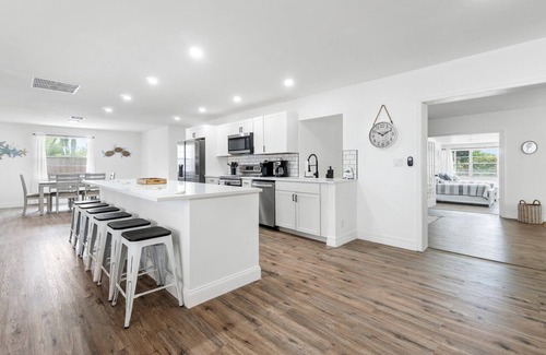 Welcome to your private retreat in beautiful West Palm Beach! This renovated 4-bedroom, 2-bath home offers 2,300+ sq ft of comfortable living space with room for up to 8 guests. Relax in the heated, private, screened-in pool while enjoying peaceful lake views from the backyard. The screened patio (Florida room) is perfect for bug-free outdoor dining and lounging.