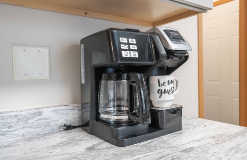 Adjacent to the main floor living room is the dining room (seating for 10) and kitchen. Fully equipped with All-Clad pots and pans, and all the gadgets you might need, our kitchen is ready for your pancake breakfasts, midday snacks, and homemade dinners. The coffee station, featuring a dual coffee maker (k-cup and 12-cup pot), ensures your morning starts right. Bonus: we provide coffee, creamer, and sugar.