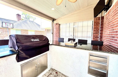 Designed to accommodate large gatherings, this home boasts a spacious commercial kitchen with a outdoor kitchen perfect for crawfish boils and is equipped with a commercial grill designed for roasting, grilling and includes a Hibachi cast iron assembly top. With its spacious rooms and comfortable beds, including a king bed, 2 queen beds, 2 sofa beds, 1 full bed, and 1 bunk bed, everyone will find their own cozy spot. The property also offers Theater Room, Game Room, with convenient amenities like heating, AC, a washing machine, WiFi, and an iron. With 4 bathrooms, there's no need to worry about waiting in line. Enjoy all that Missouri City has to offer when you stay at our place.