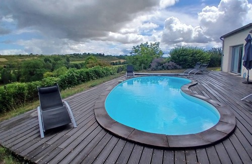 You feel on top of the world at villa Grenadier at the small holiday domain Grand Tourtre, just outside the market town of Chalais. Tucked away in an elevated position this spacious and comfortable villa is ideal for a family holiday in the Charente, weekend or short breaks, and is also a great base for guests attending weddings in the area. It has great views over the open countryside and Chalais Chateau is in full view. A swim in your pool gives you the same view. A short drive, bike ride or walk brings you to the market town of Chalais with all its amenities including bakeries, butchers, supermarkets, restaurants, and bars. It has 1 King-size bedroom, the master, with it's en-suite bathroom with bath and shower. The other 2 rooms, a double and twin room both share a bathroom with shower and toilet. There is also a seperate toilet. Open plan living space invites everyone to spend time together. Outside you will find a decked terrace with table and chairs, a 8mx4m alarmed pool, a BBQ, partly enclosed garden and parking space for 2 cars. Tennis courts, petanque piste, ping pong table and a children's play area are onsite (you are the closed villa to the tennis courts and petanque!) and shared with other holiday makers onsite.