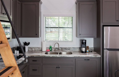 Two Creeks Crossing Resort's Deluxe Cabins with loft are nestled in the woods along Rocky Creek. Features include a back porch off the bedroom that’s perfect for sitting and enjoying the scenery, a full kitchen with refrigerator, and a 300 square foot loft that will sleep four people. Perfect for family getaways! The kitchen includes a stove top, microwave, refrigerator, coffee maker, toaster, pots, pans, cooking utensils, place settings and eating utensils. This cabin also has a propane gas grill. Sleeps 6. Smoking and pets are not allowed.