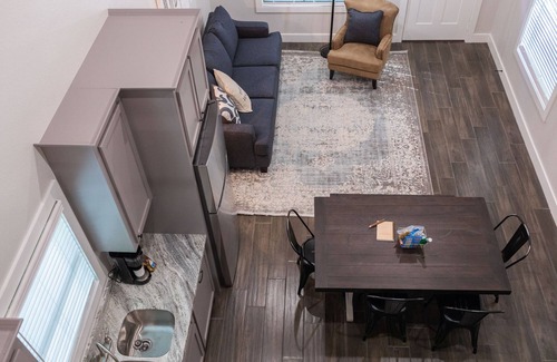 Two Creeks Crossing Resort's Deluxe Cabins with loft are nestled in the woods along Rocky Creek. Features include a back porch off the bedroom that’s perfect for sitting and enjoying the scenery, a full kitchen with refrigerator, and a 300 square foot loft that will sleep four people. Perfect for family getaways! The kitchen includes a stove top, microwave, refrigerator, coffee maker, toaster, pots, pans, cooking utensils, place settings and eating utensils. This cabin also has a propane gas grill. Sleeps 6. Smoking and pets are not allowed.