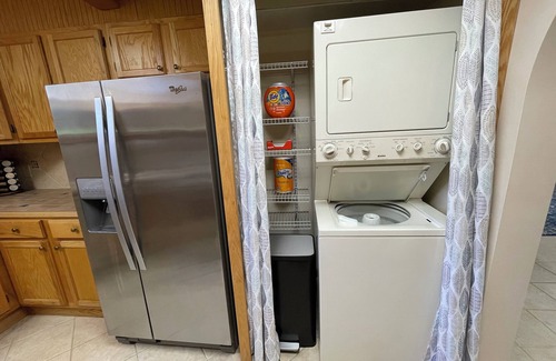 Inside, each room is comfortably furnished and generously sized. The layout includes a living room with Roku TV, a dining area, a work space, and a large bathroom with dual vanity and tub. The bedroom features a walk-in closet, and the full kitchen is equipped with a dishwasher, cookware, spices, and everything needed for home-cooked meals. An in-unit washer and dryer are provided for your convenience. The apartment is over 900 square feet.
