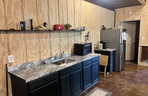 Spacious new barndominium sitting on 15 acres of scenic farmland, located 15 miles from downtown Guntersville. 5 miles from public boat ramp, ‘The Ponderosa’ is the perfect spot to watch the sunset and unwind after a successful day duck hunting or bass fishing on beautiful Lake Guntersville. ‘The Ponderosa’ has a rustic and cozy feel with two bedrooms, one bath, comfortably sleeping up to 7 people. The primary has a Queen and a twin, and connects to the bathroom with a standup shower, toilet, and sink. The secondary has two full beds. The open living room is the perfect place to unwind and watch the game on the big screen tv while relaxing on the reclining sofa or leather recliner. Long wood table can sit up to 10 people. Kitchen features a large sink, refrigerator, air fryer, and Keurig coffee maker. Enjoy a night out at The City Harbor, with lots of food, drink, and shopping options, featuring local musicians and beautiful lake views.