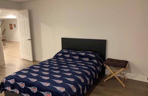 This spacious basement suite features a private entrance, two bedrooms, and a fully equipped kitchen, all set in a pleasant neighborhood. Each bedroom includes a comfortable double bed. The kitchen is complete with a coffee maker, kettle, oven, stove, fridge, freezer, and a dining area.