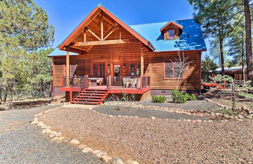 Between scenic alpine lakes, all-season recreation, and plenty of golf courses, 'Blue Roof Lodge' offers a unique Show Low getaway. Spend days hiking in the surrounding national forest or boating at Fools Hollow Lake, then grab a local brew in town before you head back to this welcoming cabin. Nestled among tall pine trees on a 1 acre lot, this woodsy 3-bedroom, 2.5-bath vacation rental features multiple indoor and outdoor living spaces — perfect for adventurous families and outdoor enthusiasts.