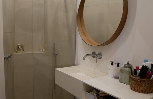 A bathroom completes the apartment with a bathtub, two sinks and a toilet. The entrance is composed of a large reception area with a piano and cupboards (washing machine dryer). Separate toilets are also in the entrance. The apartment is located on the 3rd floor of a 1930s building. With two elevators (one to access the first landing and a second).