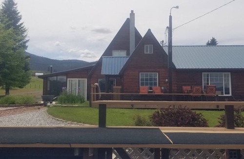 Jan 4th - Apr 23rd 30 night min. only $70 per night. Nestled in countryside of Kettle Falls, this delightful Lake and mountain view home offers a peaceful retreat for guests. Unique hand hewn pine interior in small original portion of home. 2 bedrooms including a king bed, queen bed, and futon, along with 2 full bathrooms , 0ne with a bathtub and shower, other with jet tub. This amazing property provides all the comforts of home. The living room with sofa bed. Whether you're looking to unwind or explore the area, this unique house is the perfect home base for your getaway. 10 min. to small town, 25 min to a larger town. 6 mi. to marina, 100 miles of boating Lake Roosevelt. Columbia River, 2 miles as a crow flies. Smaller Kettle River nearby. Miles and Miles of Forest area for horseback, ATV, snowmobiling, hunting or hiking all hop skip n jump away. 26 mi. from Canadian Border 1 hr from Lake Curlew. Small fishing lakes within the area. Beaches 5-25 min away. visit. the 2 mules on property. Contact host about property site entrance and surroundings prior to approaching house as the photos do not reflect the who;e property and photos were taken at prettiest time of year. There are other units on the property although the house is quite private and faces the landscaping, the rolling hills and the amazing lake only. Plenty of uncovered parking for toys. All my guests say to me is, " Amazing views and very accommodating! love the space! Disclosure. There is a friendly dog at Cabin 100- 200' away to the side of house but set back behind a ways. , and you may hear her bark occasionally or see her run about. Pics of house outside are from all angles, so you will recognize it when you drive up, as you come up to the backside of the house. all large view windows are in front and back is private w/ few small windows. Once at the house, all you pass is behind you, and all you can see is the Beautiful Lake, Landscaping, Rolling Green Hills.. Pics of inside to come. If they are not here, please ask for them. The home is fully and attractively furnished. Houseplants, Wood Stove and other other heat sources.wood included. Most all amenities in kitchen, bath and bedrooms that you might need. bbq, table and cusioned chairs on huge view deck w. lounge chair( seasonal. . PLEASE MESSAGE ME BEFORE BOOKING as I also have another vacation calandar that I have not synced yet with VRBO. DISCLOSURE. there are some cracked and missing tiles on front patios. But still very pleasant. These pics were taken 3 yrs ago in summer. Inside pics will be current. recommend front wheel drive w/ studs or 4 wheel. short distance on private drive. familiarity w/ wood stove recommended. wood provided. other heat sources available to supplement stove.
