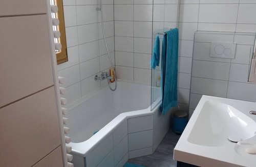 Upstairs, two bedrooms with double beds, a small room with single bed, a bathroom with tub / shower. One of the double rooms has an adjoining room (reading room or playroom, possible to put cot). Numerous games and books for everyone (from 7 months to 77 years old).
