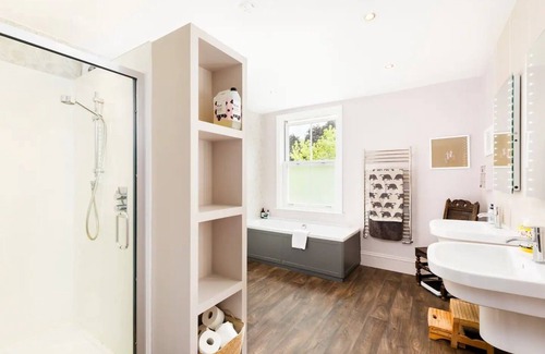 On the first floor there is a large luxurious bathroom, with bath and separate walk-in shower. Moving upstairs there are three generous bedrooms. The large master bedroom offers a Super King bed, south-facing bay window and ample storage for guests. The second bedroom has a King size bed, a double wardrobe, and views out to the garden. The third bedroom contains a double bed.