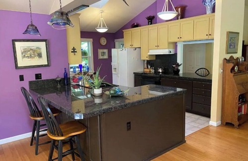 INDOOR LIVING: The spacious, fully equipped kitchen boasts two seating bars with elegant granite countertops. Small appliances include a coffee maker, coffee grinder, Vitamix blender, crock pot, juicer, toaster, and popcorn maker. Adjacent to the kitchen, you'll find a cozy coffee and juicing nook as well as a pantry. The open living room features high vaulted ceilings, leather reclining couches, a 70" smart TV with sound bar and subwoofer, a DVD/VCR, and a wood stove with a custom stone backdrop. The dining room, connected to the living room and kitchen, has a table that seats six but can be expanded for additional guests; there's also a bistro table for two, and the seating bars accommodate four. The sunroom offers skylights, three sliding glass doors, radiant floor heating, various seating options, and musical instruments (piano, guitar, rain stick, maracas). Free high-speed internet and Wi-Fi are provided by Starlink.