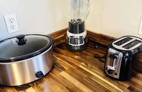 - Modern kitchen with butcher block countertop, newer appliances, and a Keurig coffee station.
