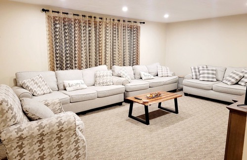 The living room boasts ample seating space for guests. One of the couches is also a pull out bed that turns into a queen bed for 2 people to sleep on. Sheets/extra pillows/comforters are provided additionally as well.