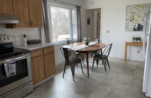 The beach is all small flat rocks(shale) and has a deck and 45 foot dock. There are some stairs (approx. 20) from the lawn to the beach area. The new deck is about 1/3 the way down from the lawn. The water is very clean and there are no weeds in this area. It's crystal clear and you can easily see the bottom. It's a nice gradual walk out into the water and is about three feet deep at the end of the dock, which is great for kids- no drop offs. There are two kayaks with life-jackets for your use. For extremely large groups, we also own another home a short walk away with three bedrooms and sleeps 10 that you can inquire about. Auburn is only a quick drive (a few miles)away, so it is very convenient for shopping, restaurants, parks,etc. There are many things to do in the area depending on your interests.