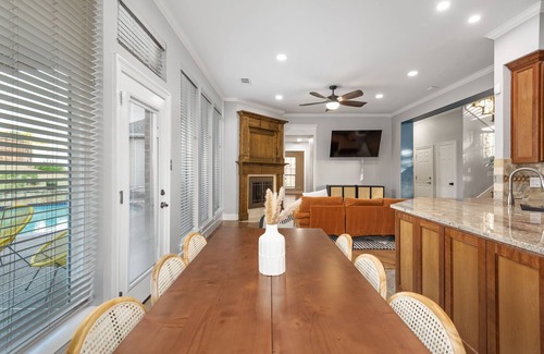 As you enter this stunning and spacious home, you are greeted with plenty of space to host your family and friends! This two story home has an abundance of windows that flood the common space with warm and soft natural light to illuminate your atmosphere. As soon as you check-in, kick your feet up and unwind in the comfy living room that features a beautiful orange sectional couch as well as a gas fireplace to cozy up next to! Watch your favorite shows or the big game while spending time with your friends! If you're looking for more entertainment, head no further than the in-home game room that features a FULL size pool table or pick from any of our provided board games!