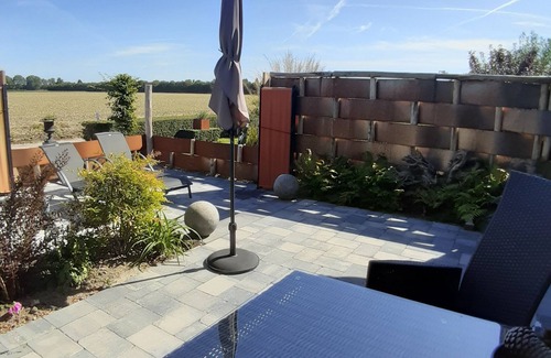 Living room with open kitchen and patio doors to your private garden. Sunny terrace with seating and sun beds.