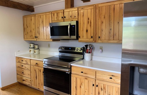 Kitchen is fully furnished for your enjoyment: coffee maker, microwave, oven/stove, dish washer, hand mixer, etc. Living room with fireplace is furnished with leather sofas and TV/DVD. Games/puzzles/books are on hand. The house is heated with a log-burning fire place (wood provided) and supplemental heat by central heating.