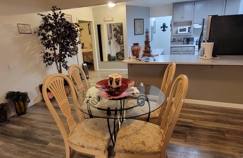 Fully functional stocked Kitchen with pot/pans, coffee, tea Coffee Creamer, Water Bottles and so much more! Salon Products and lots of extra amenities for you to have a pleasant stay.